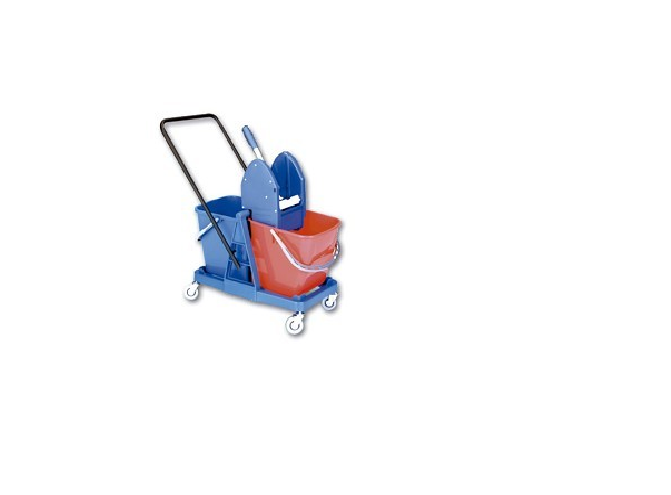 Carro indiustrial equipado con dos cubos de 25 litros, una prensa vertical y manillar metálico para su manejo.