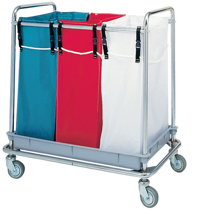 Carro de ropa chasis cromado, bandeja de soporte de plástico de polipropileno. Con 3 bolsas de plástico para mejorar la clasificación. Ruedas de 125 Ø. Capacidad bolsa: 77 Lts./c.u.