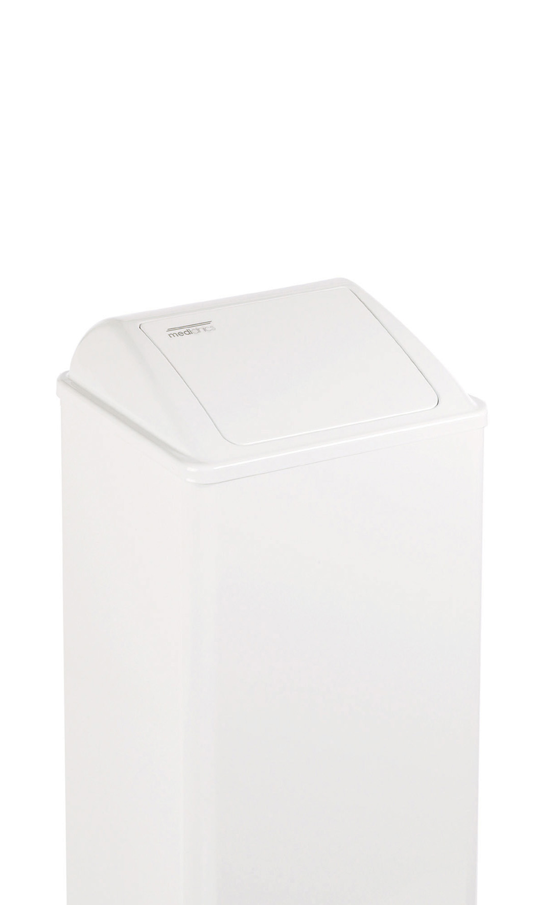 Papelera rectangular con cabezal fabricada en acero epoxi blanco con tapa de accionamiento manual con auto-retorno, 80 Litros de capacidad y de accionamiento manual. Pueden apoyarse directamente sobre el suelo o adosarse a la pared. Adecuadas para lavabos y áreas públicas interiores de tráfico muy alto. Perfectas para ser colocadas en zonas comunes como oficinas , despachos, halls, instalaciones deportivas, tiendas, aeropuertos, centros comerciales, etc. por su diseño moderno y versátil que las hace muy fáciles de integrar en cualquier lugar. Sistema de sujeción para fijar la bolsa de residuos en el interior. Sistema anti-humedad incorporado en la base de las papeleras que las aísla de la humedad del suelo. Cuenta con 4 tacos que aislan el fondo de la papelera de la humedad.