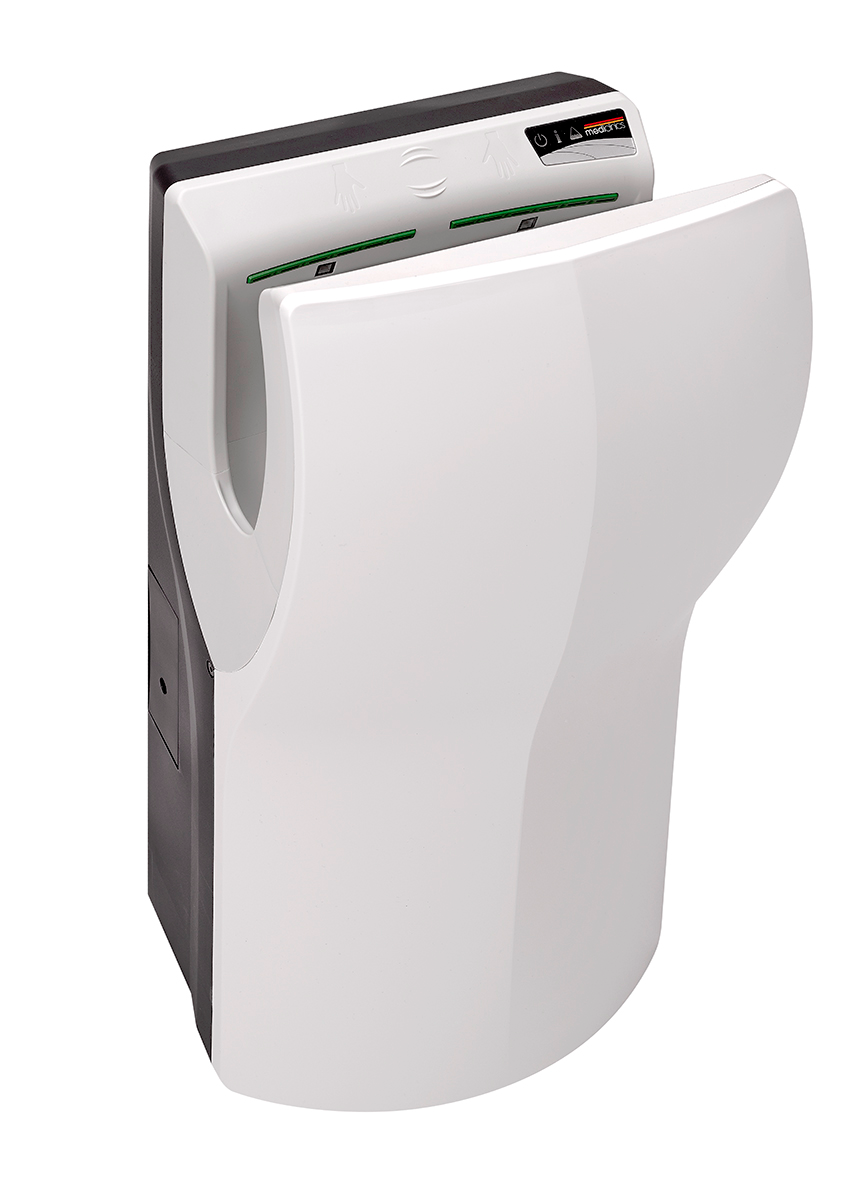Secador de manos por aire tipo “hands in” de nueva generación,fabricada de plático ABS de 3 mmm de espesor rápido eficiente y de diseño elegante, muy adecuado para lugares con una alta frecuencia de paso,. TIene 2 pares de sensores infrarrojos en ambos lados de los embellecedores exteriores para el accionamiento automático.ncorpora un medio filtrante HEPA que filtra las partículas sólidas en suspensión (polen, ácaros del polvo, humo del tabaco, etc) mejorando notablemente la calidad del aire. Este tipo de secadores de manos son muy prácticos y fáciles de utilizar, ideales para centros de ocio, bares, clubes deportivos, restaurantes, bares, colegios y muchos otros.Es un artículo muy demandado, ya que suponiendo una inversión inicial se compensa rápidamente por el ahorro que supone en cuanto a gasto en electricidad. Dispone de un depóssito interno para recoger el agua de 500 ml., el depósito de agua se vacia a través de una valvula exterior o bien extryéndola. Señal acústica y óptica de tanque de llenado. Leds frontales que muestran el estado de la secadora de manos.
