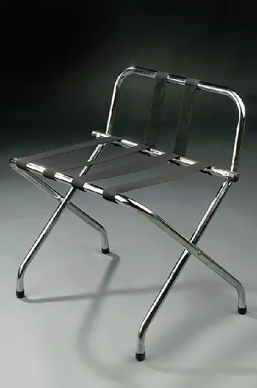 Soporte para maletas de hotel con respaldo metálico cromado. Fabricado en tubo de acero cromado con cintas de nylon de color negro. Preparado para soportar hasta 40 kg de peso.
