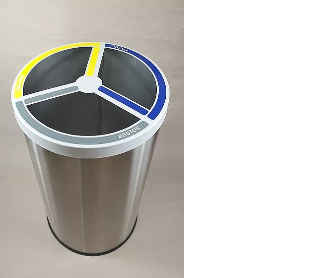 Papelera de reciclaje metálica pintada (150L) circular con tapa. Clasificación para tres tipos de residuos. Cubetas para residuos 3 x 42 litros.