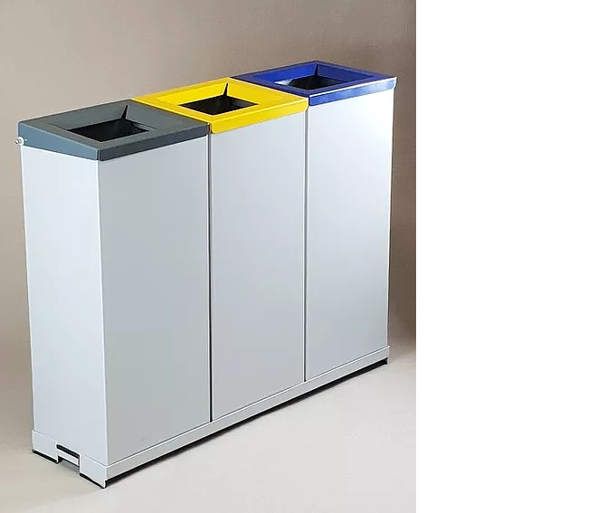 Papelera selectiva tiene tres cubetas de 45 Litros que incorpora un zócalo y cabezal para que queden fijados de forma conjunta, pero que a la vez se facilite el separado de los residuos para su correcto depósito y posterior reciclaje. Este tipo de papelera permite clasificar en 3 cubos distintos de forma estándar.