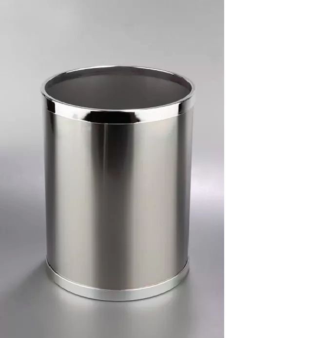 Papelera pequeña redonda de acero inoxidable satinado . Fabricada en chapa deacero inoxidable satinado AISI304 de 0,8 mm de espesor. Complementos plásticos en fondo y superior en plástico inyectado cromados. Tiene una capacidad de 10 litros, con lo que se trata de una papelera de tamaño reducido, en su base tiene una protección de caucho, de forma que aunque se arrastre o incline, no ralla el suelo ni el rodapié. Gracias a su reducido tamaño, este pequeño cubo de basura puede colocarse en cualquier lugar por reducido que sea el espacio, ya que tiene 20 cm de diámetro y cabe en cualquier lugar. Por ello, es una papelera de lo más práctica para habitaciones de hotel, salas de espera, o para el uso habitual de los trabajadores en oficinas o similares, siempre en lugares en los que no se genere gran cantidad de residuos.