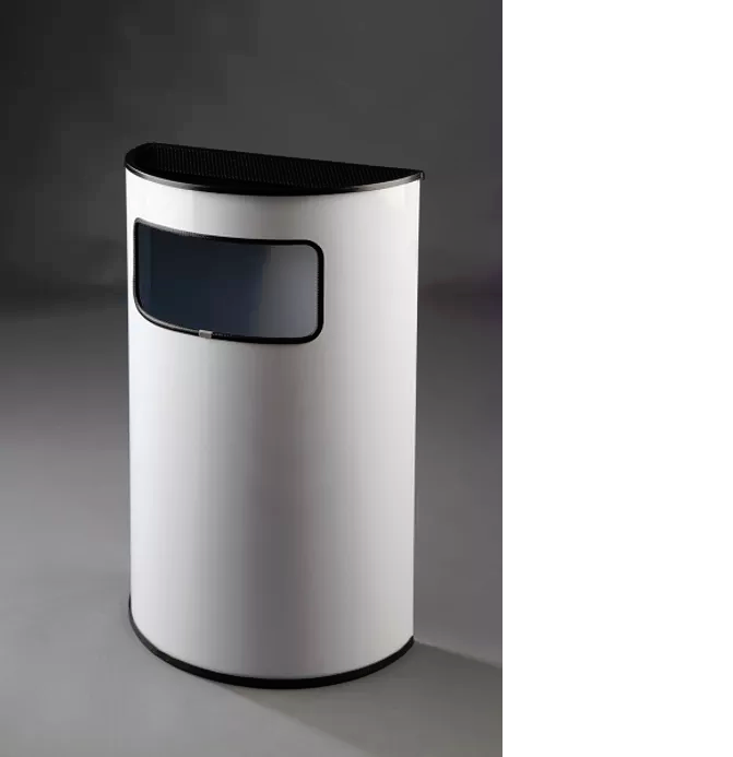 Papelera- Cenicero de chapa con capacidad 90 litros , semicircular , con cubo interior y boca frontal, pintada . Fabricada en chapa electrocincada de 1,0 mm de espesor. Lacada con pintura poliester de color a elegir. Resistencia a la oxidación testada en prueba de nieblas salinas por encima de las 300 horas. Complementos plásticos en fondo y superior en plástico de color inyectado negro. Colillero metálico pintado . Modelo diseñado para zona interior de grandes superficies .